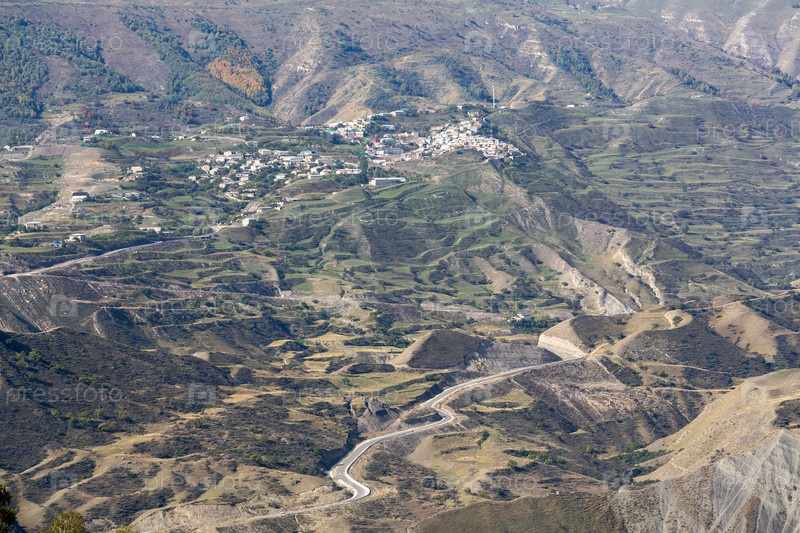 Вид осеннего пейзажа в горах Дагестана, Северный Кавказ, Россия. Террасы и высокогорная деревня расположены на склоне горы. Путешествие по горной местности