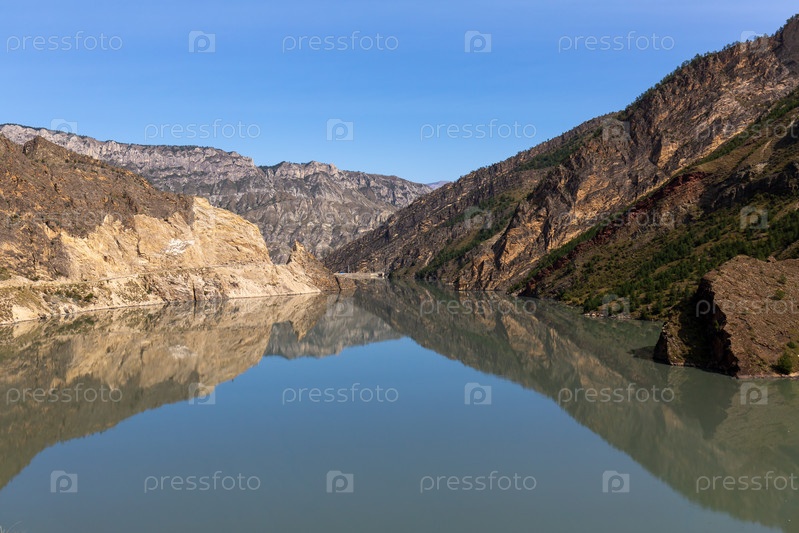 Панорамный вид на Гоцатлинское водохранилище в горном районе Дагестана