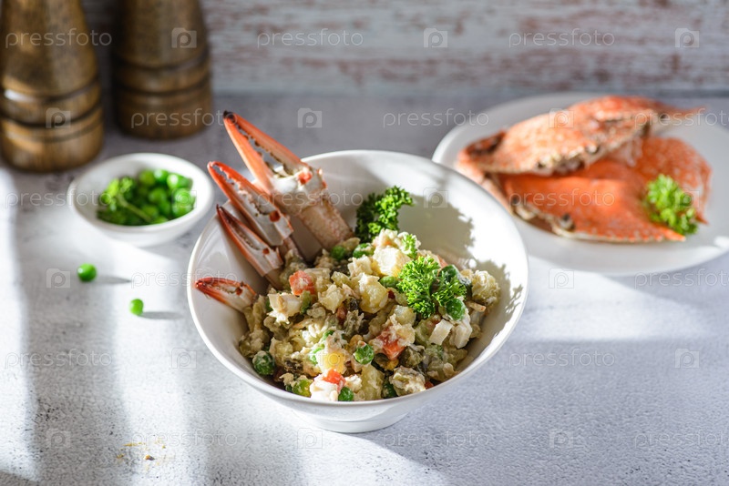 Салат оливкового сорта с русским крабом