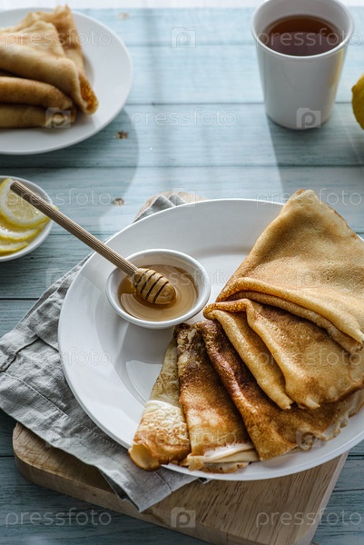 Крейпы с медом на деревянном фоне