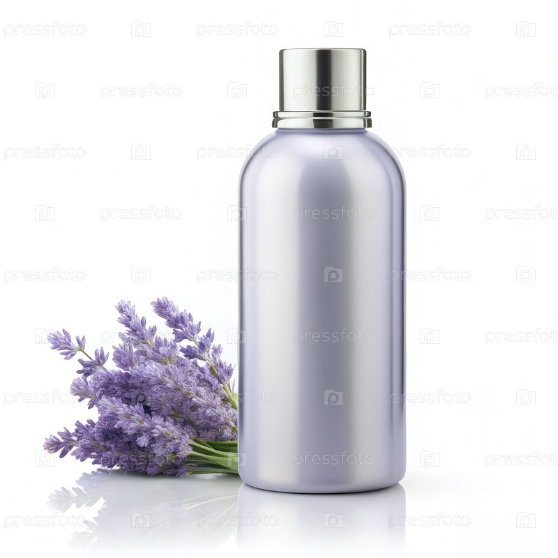 Бутылка кондиционера с ароматом лаванды со серебряной крышкой на белом фоне