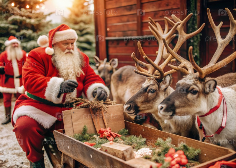 Санта Клаус готовит своих оленей на Рождественскую ночь