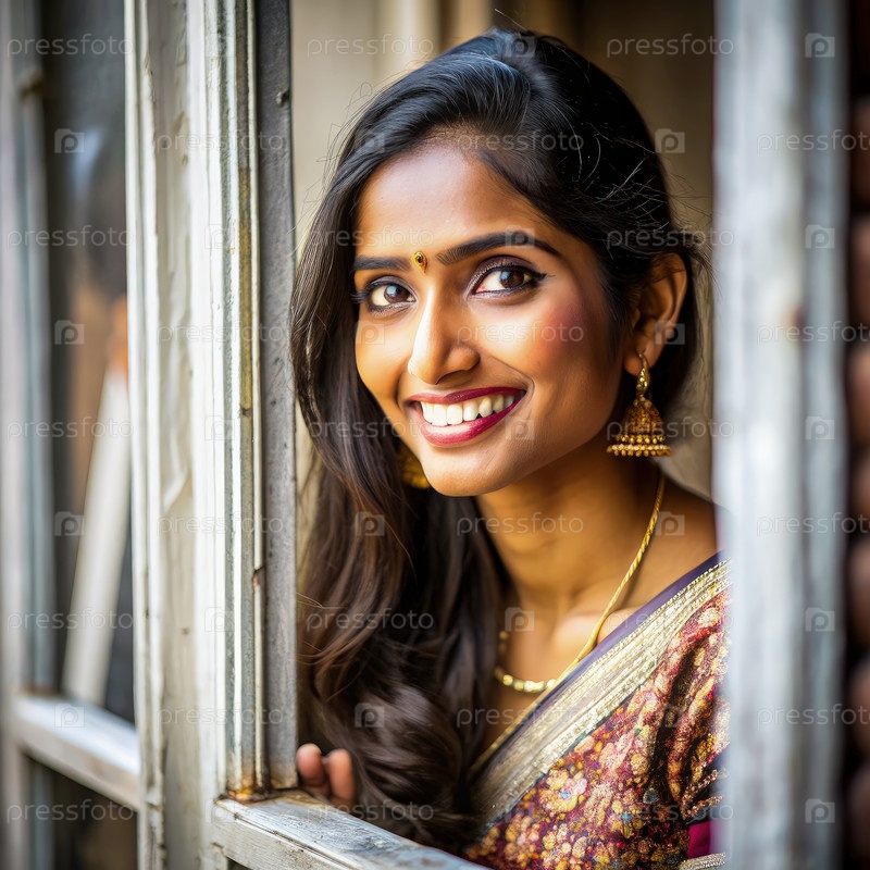 Молодая индийская женщина смотрит из окна в традиционном сари