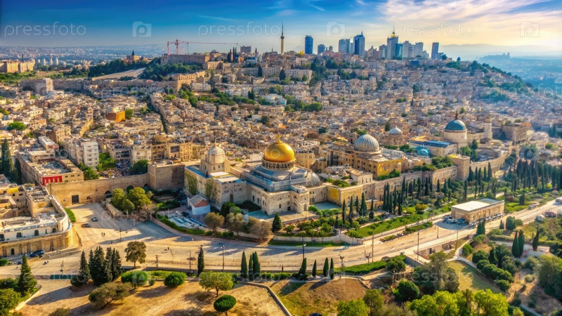 Вид с воздуха Старого города Иерусалима и Купола Скалы на закате
