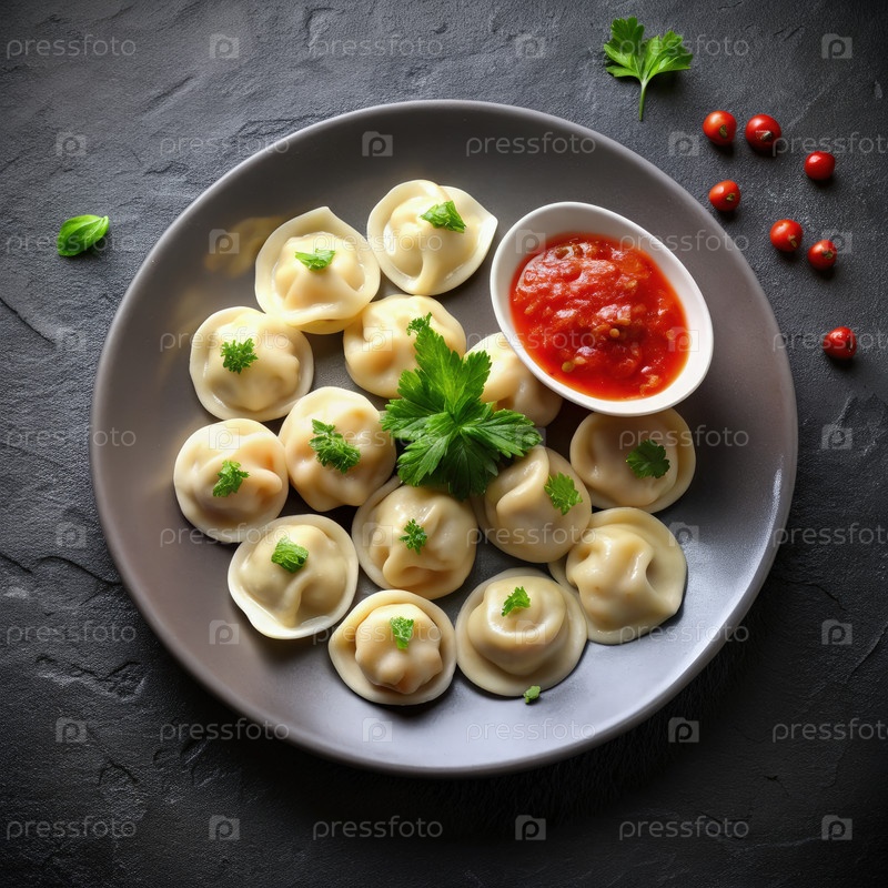 Свежеприготовленные пельмени с томатным соусом на серой тарелке