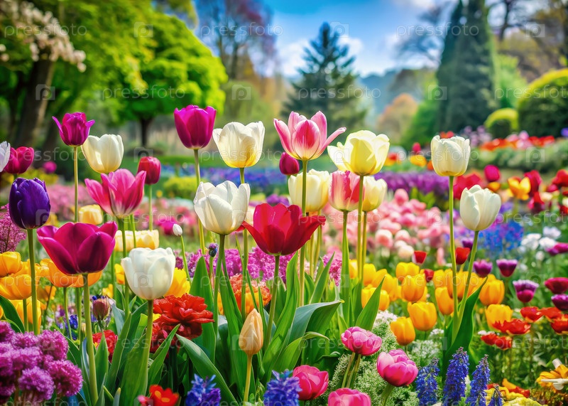 Красочный сад тюльпанов цветет в солнечный весенний день