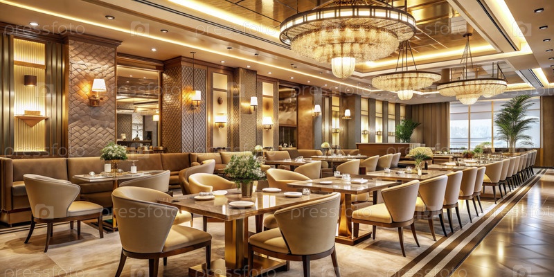 Элегантный бежевый интерьер ресторана с золотыми акцентами и люстрами