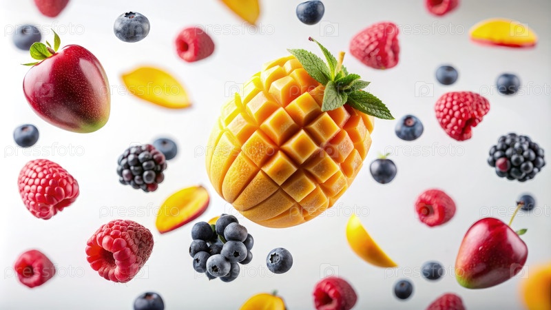 Манго и ягоды на белом фоне