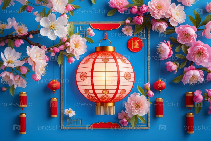 AI Generative Background Традиционные китайские символы Нового года с фонарями и вишневыми ветвями