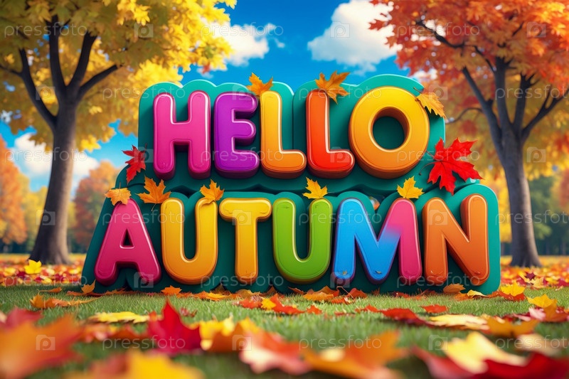 AI Generative Поздравление с надписью Привет, осень-осень на фоне желтых и красных листьев