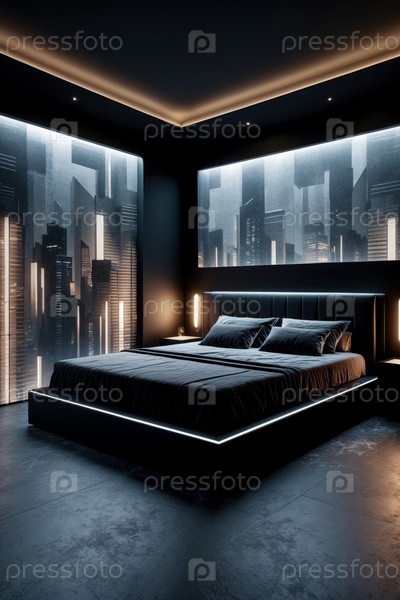 Уютный интерьер Спальня Квартирная комната Черный цвет, Комфортный дом Дизайн современного дома AI Generative