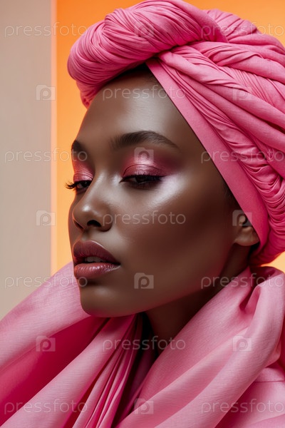 ИИ генеративный портрет молодой женщины естественно чистый помада макияж, модная модель красоты в розовом костюме