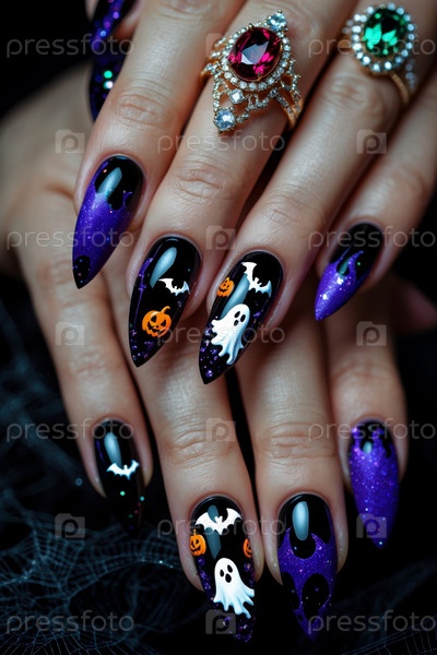 Тематический осенний маникюр ярких цветов черный и фиолетовый с праздничными узорами Хэллоуин AI Generative