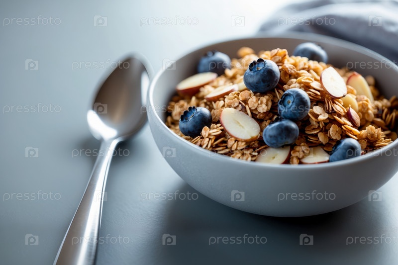 Гранола овсяная крупа йогурт, ягоды и фрукты, традиционный здоровый вегетарианский завтрак AI Generative