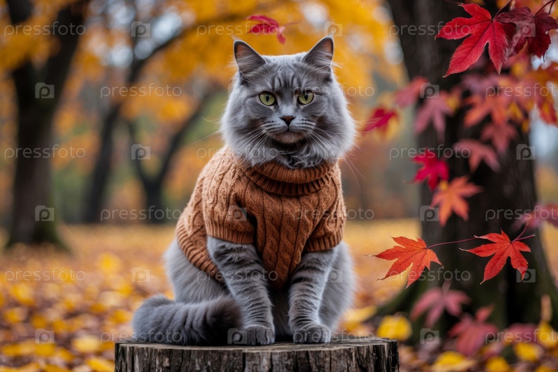 Кошка в трикотажном свитере на фоне осеннего леса, животное в красно-желтых листьях AI Generative