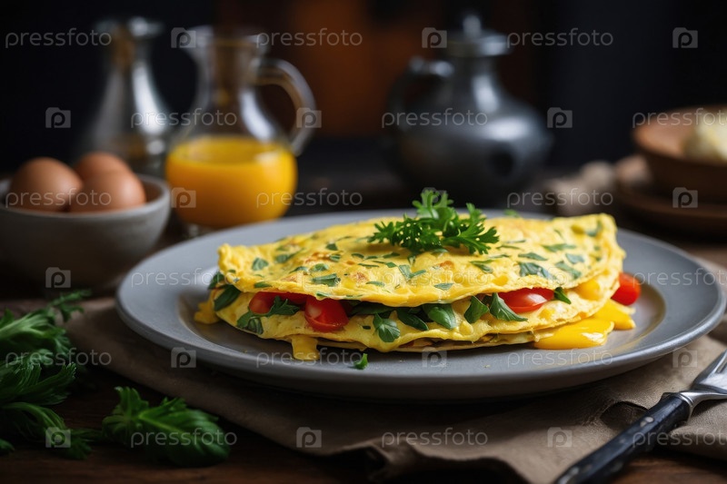 ИИ генеративные яйца омлет с овощами и зеленью, сердечная вкусная традиционная кулинарная бранч-кухня