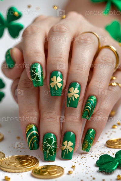 Тематический весенний маникюр в ярко-зеленых цветах с праздничными узорами Дня Святого Патрика AI Generative