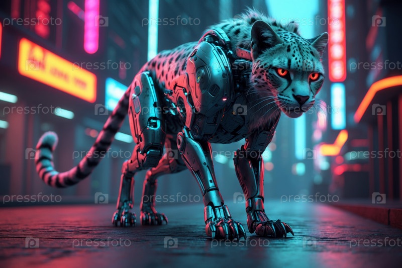 Фантастическое мифологическое животное из сказки, дикая кошка с механическими частями тела