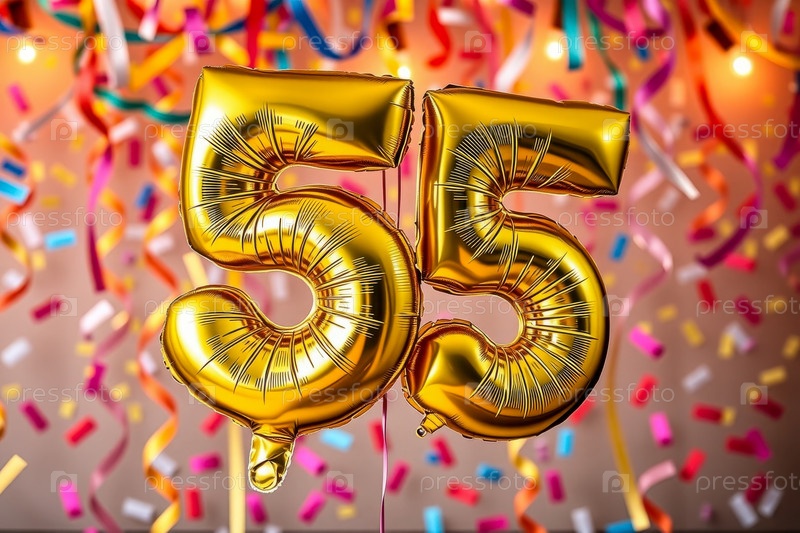 Гелиевый баллон на день рождения номер пятьдесят пять, фигура из золотых букв 55 праздник праздничный фон