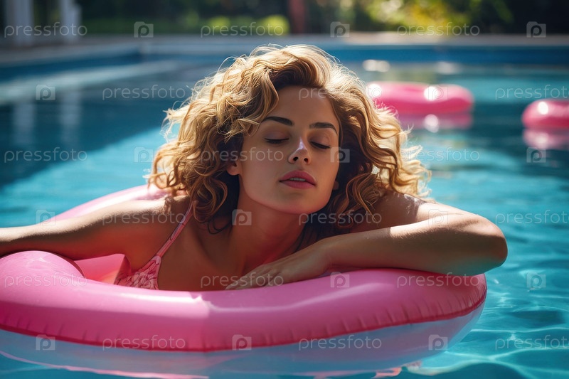 Молодая женщина в бассейне надувное кольцо, человек отдыхает в отеле море океан AI Generative