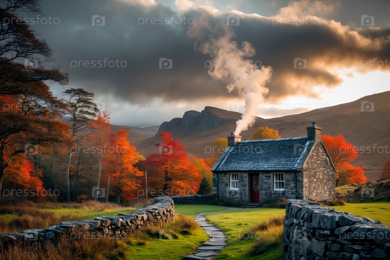 Дом здания ландшафтный фон красные и желтые листья осень-осень осенний лесной парк AI Generative