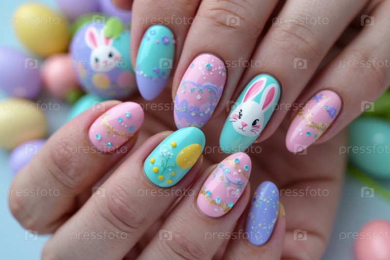 Тематический весенний маникюр в ярких пастельных розовых цветах с праздничными пасхальными узорами AI Generative
