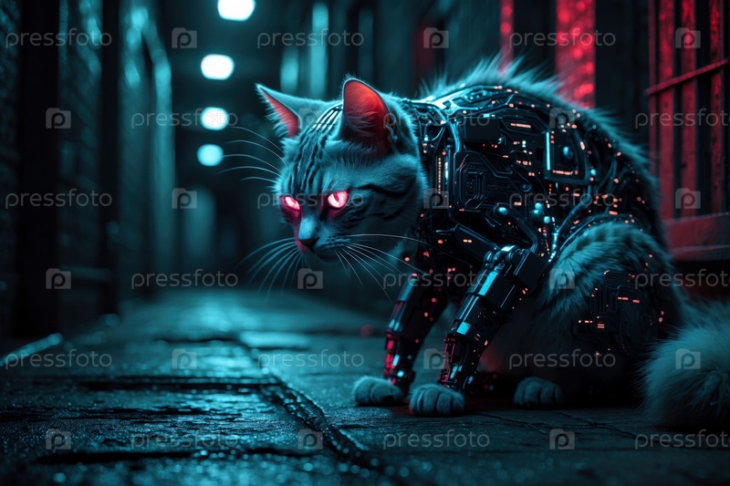 Фантастическое мифологическое животное из сказки, дикая кошка с механическими частями тела