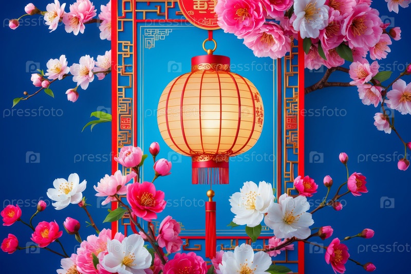 AI Generative Background Традиционные китайские символы Нового года с фонарями и вишневыми ветвями