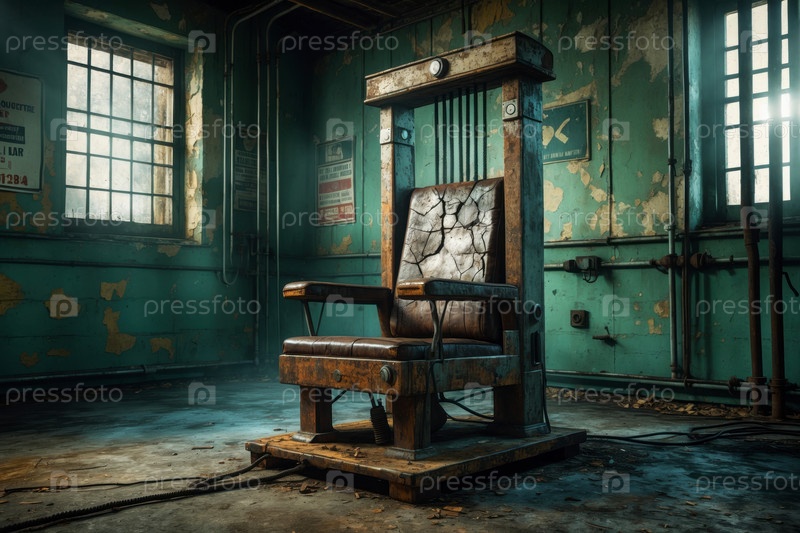 Интерьер камеры смертной казни, наказание заключенный виновен в электрическом стуле AI Generative
