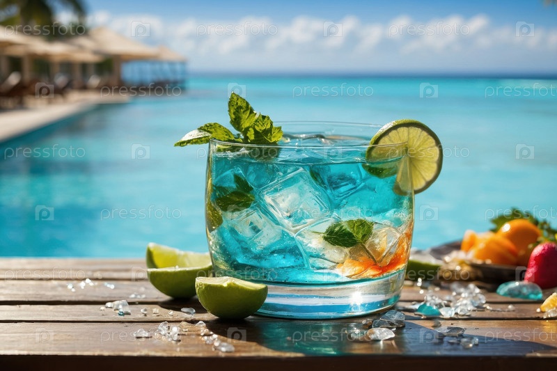 AI Generative Алкогольный коктейль на фоне бассейна, летний напиток фрукты в отпуске sea ocean