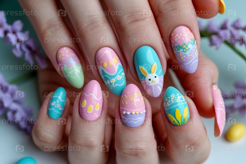 Тематический весенний маникюр в ярких пастельных розовых цветах с праздничными пасхальными узорами AI Generative