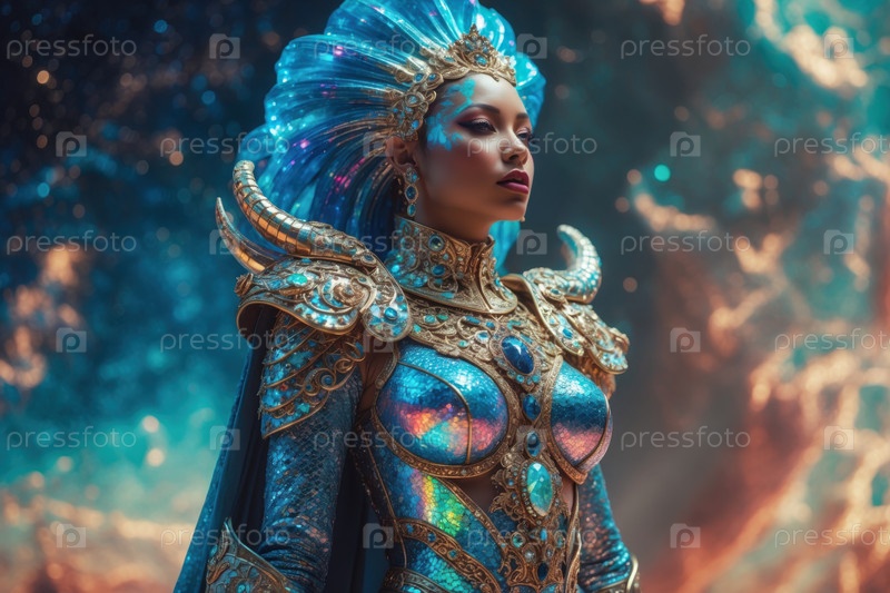 AI Generative Женщина-гуманоид в футуристическом космическом костюме, человек на будущем научном фантастическом завтрашнем фоне