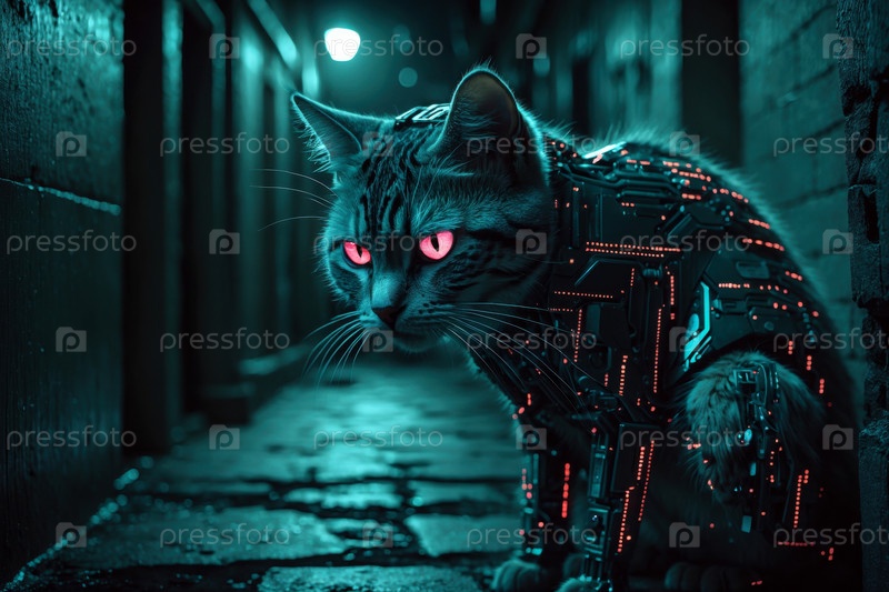 Фантастическое мифологическое животное из сказки, дикая кошка с механическими частями тела