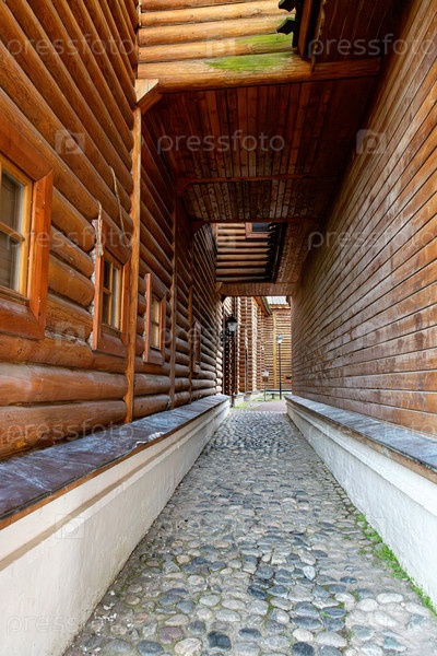 Узкий брусчатый проход с мощеной дорожкой между высокими стенами дворца царя Алексея Михайловича в музее-заповеднике Коломенское, Москва