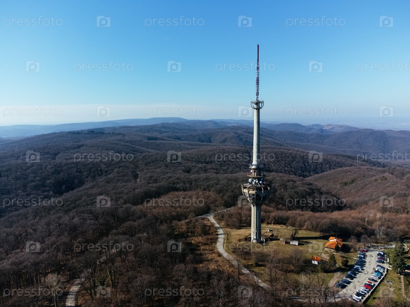 Вид с воздуха на телевизионную башню, подвергнутую бомбардировке армией НАТО в 1999 году, Irishki venac, Башня Фрушка, Нови-Сад, Сербия, Европа