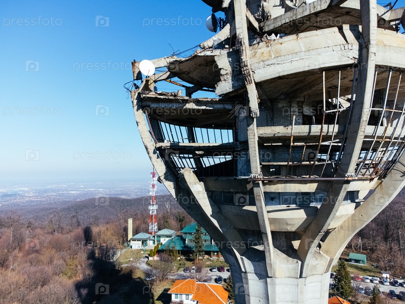 Вид с воздуха на телевизионную башню, подвергнутую бомбардировке армией НАТО в 1999 году, Irishki venac, Башня Фрушка, Нови-Сад, Сербия, Европа