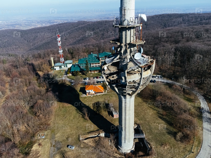 Вид с воздуха на телебашню, бомбардированную армией НАТО в 1999 году, Irishki venac, башня Фрушка, Нови-Сад, Сербия, Европа