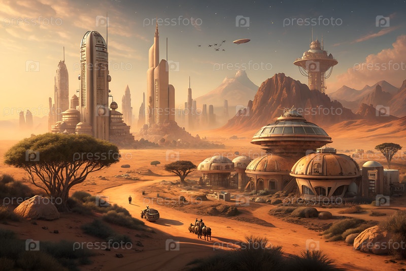 Футуристический научно-фантастический город на пустынной планете с передовыми башнями, машинами по уборке урожая и инопланетным пейзажем под несколькими лунами при закате солнца