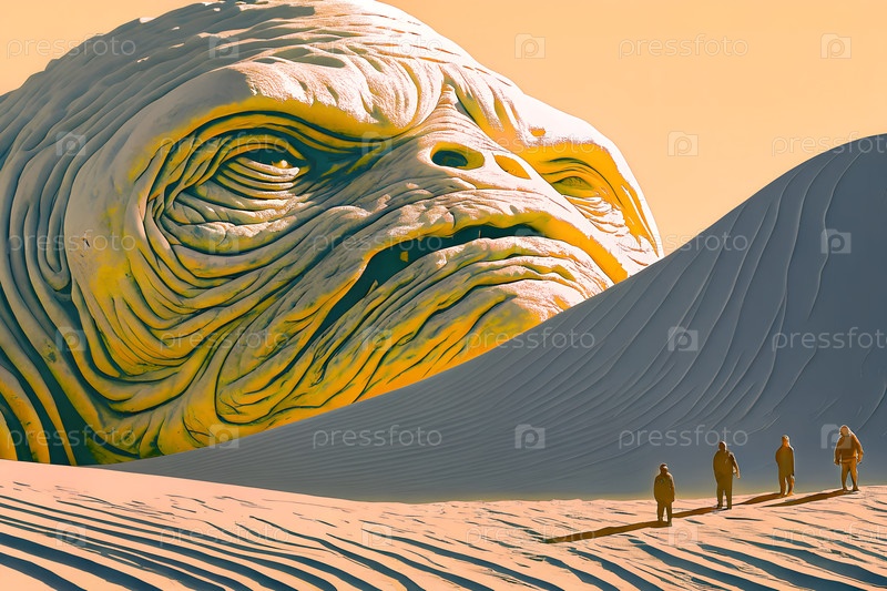 Эпическое гигантское пустынное существо, поднимающееся с песчаных дюн в то время как одинокий путешественник приближается к огромному кинематографическому ландшафту фантазии