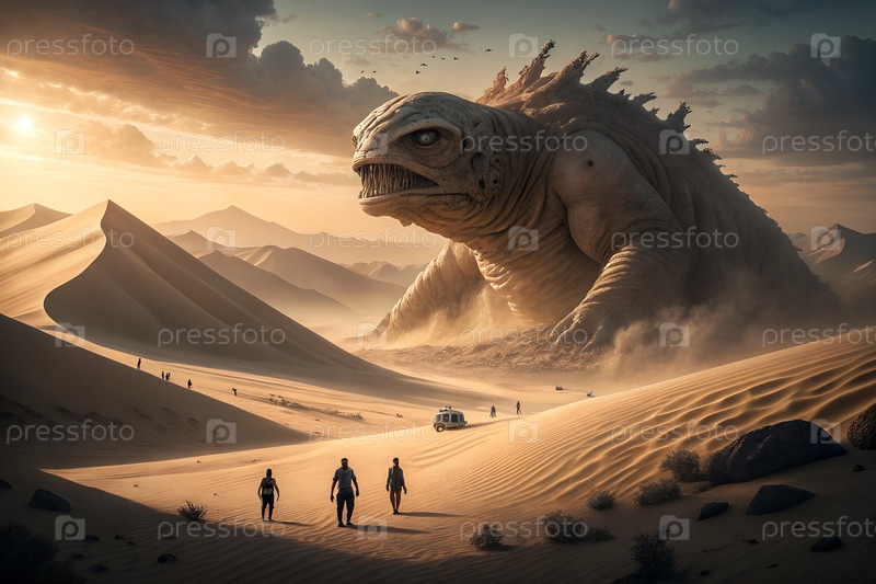 Эпическое гигантское пустынное существо, поднимающееся с песчаных дюн в то время как одинокий путешественник приближается к огромному кинематографическому ландшафту фантазии