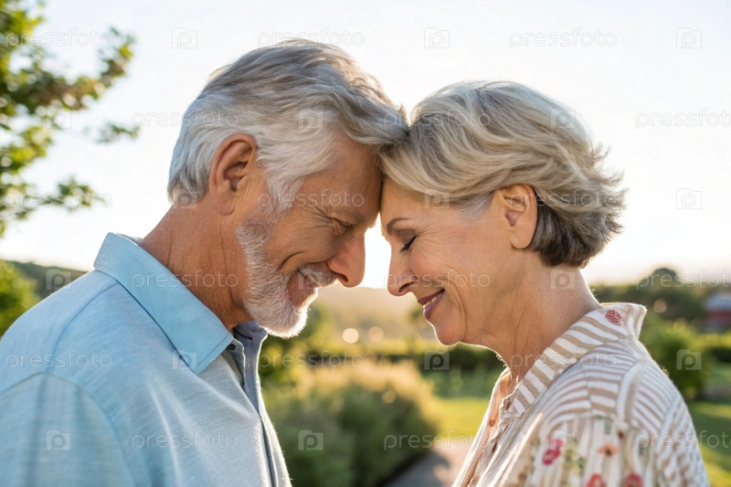 Любящая старшая пара, прикасающаяся к лбу и улыбаясь, близкий портрет пожилых партнеров, разделяющих нежный момент