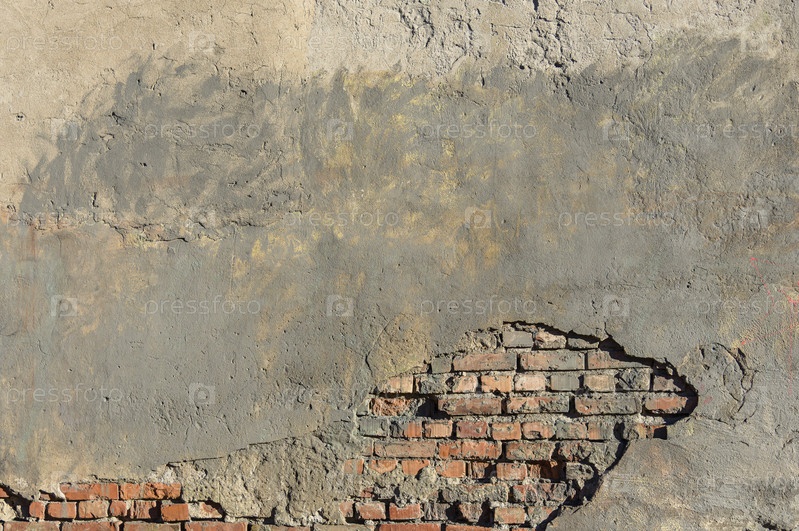Открытая кирпичная стена с текстурированным фоном из серой штукатурки