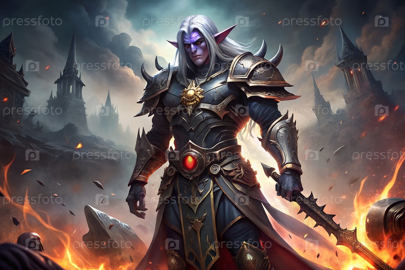 Эпический воин-темный эльф со светящимся волшебным посохом на мистическом поле битвы, кинематографический персонаж фантазии в доспехах. g
