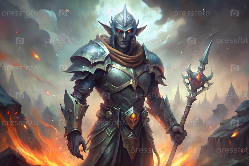 Эпический воин-темный эльф со светящимся волшебным посохом на мистическом поле битвы, кинематографический персонаж фантазии в доспехах. g