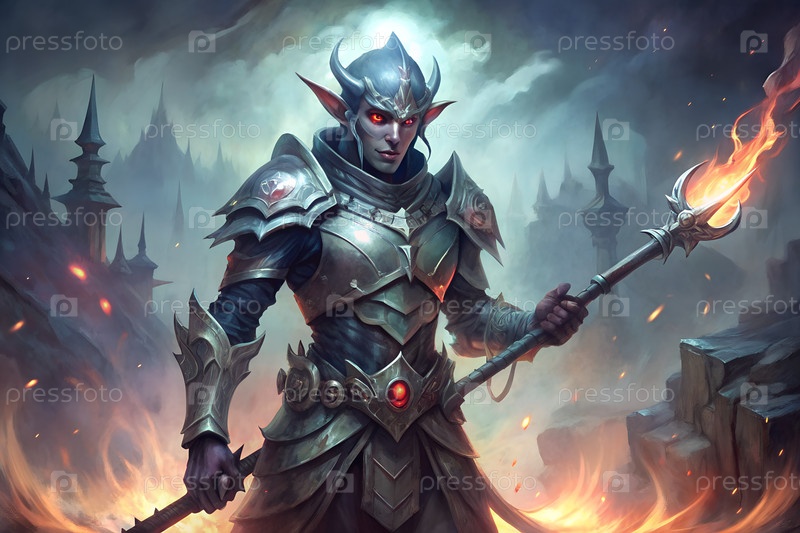 Эпический воин-темный эльф со светящимся волшебным посохом на мистическом поле битвы, кинематографический персонаж фантазии в доспехах. g