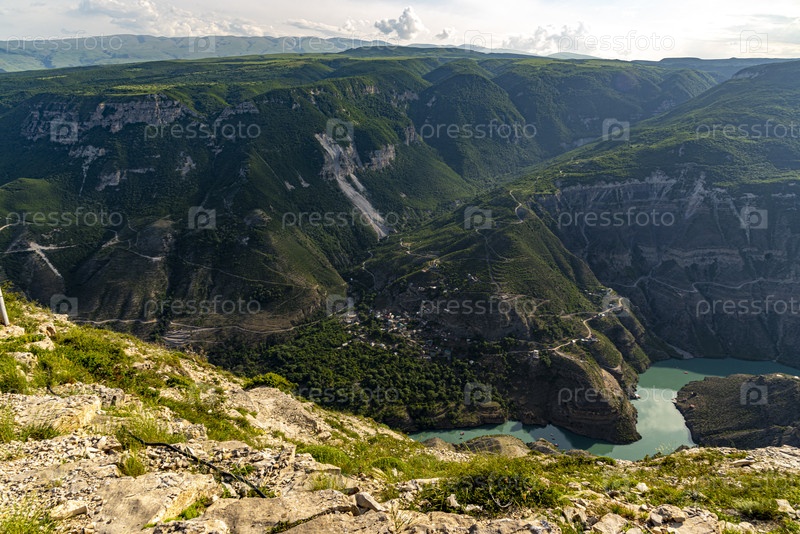 Панорама горного каньона с рекой и серпантинной дорогой в Дагестане