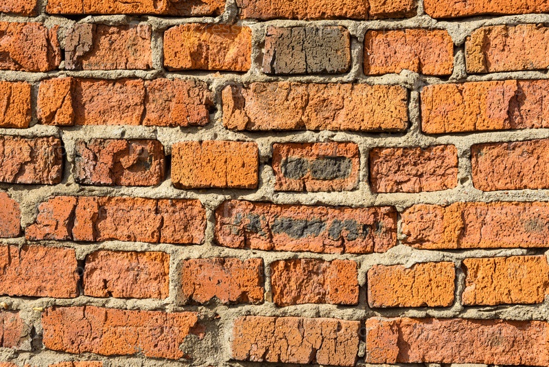 Фактурная стена из красного кирпича с трещинами и зазорами от раствора