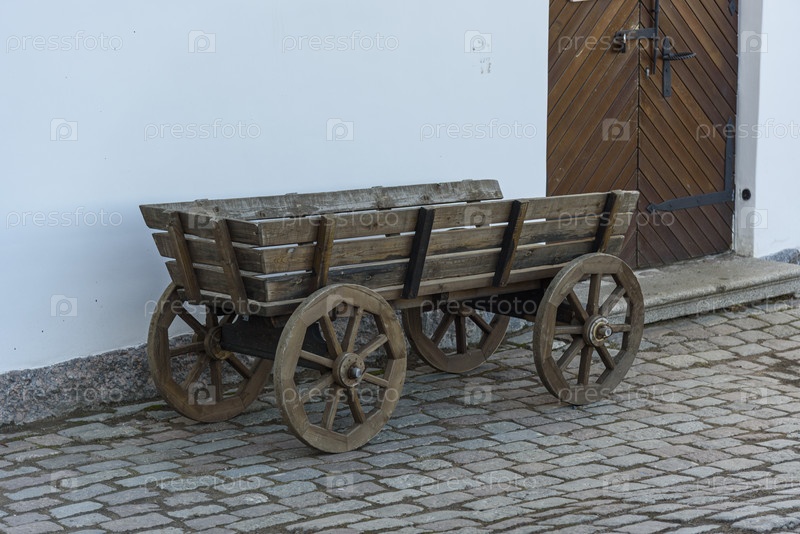 Старинная деревянная телега, поставленная рядом с дверью в деревенском стиле