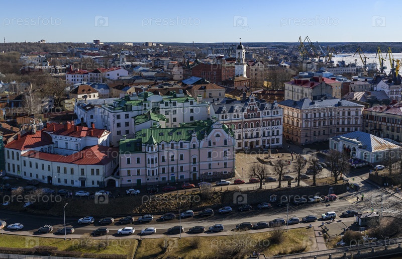 Живописный вид с высоты птичьего полета на прибрежный городской пейзаж с исторической архитектурой в Выборге
