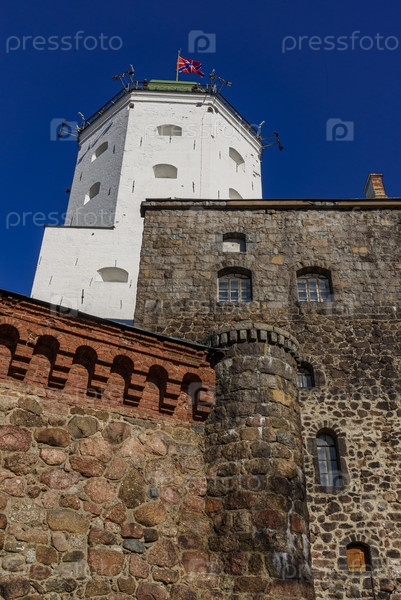 Исторический Выборгский замок и башня Святого Олафа с зеленым куполом и каменными стенами на фоне ясного голубого неба